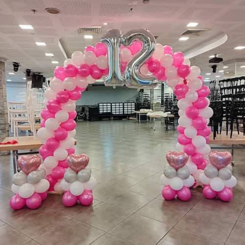 שער בת מצווה בשילוב 4 לבבות מעל מעמדי בלונים