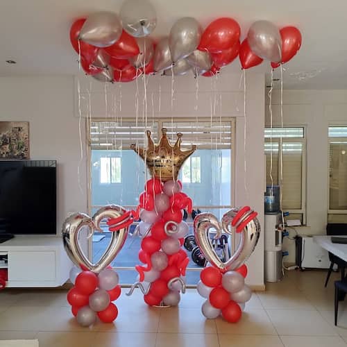 בלון כתר ענק ומהמם מעל סטנד בלונים גובה ומרשים במיוחד עם כיתוב אישי מהמזמינים על גבי הכתר.